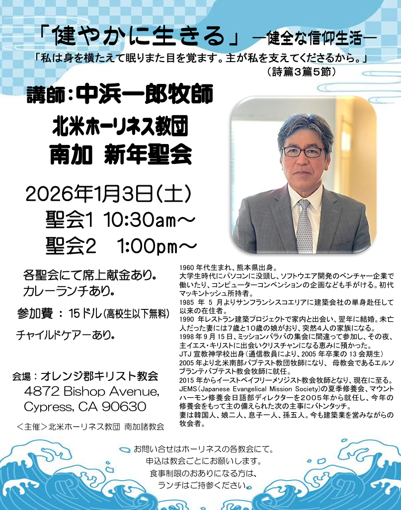 1月3日(土)午前10:30からオレンジ郡キリスト教会で行われます。